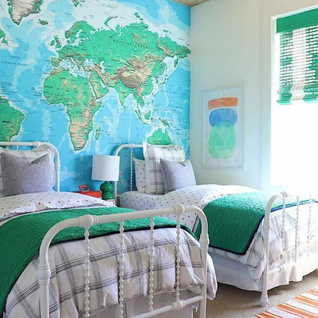 Wooden world map art hangs above the bed, sparking wanderlust and geographic curiosity.