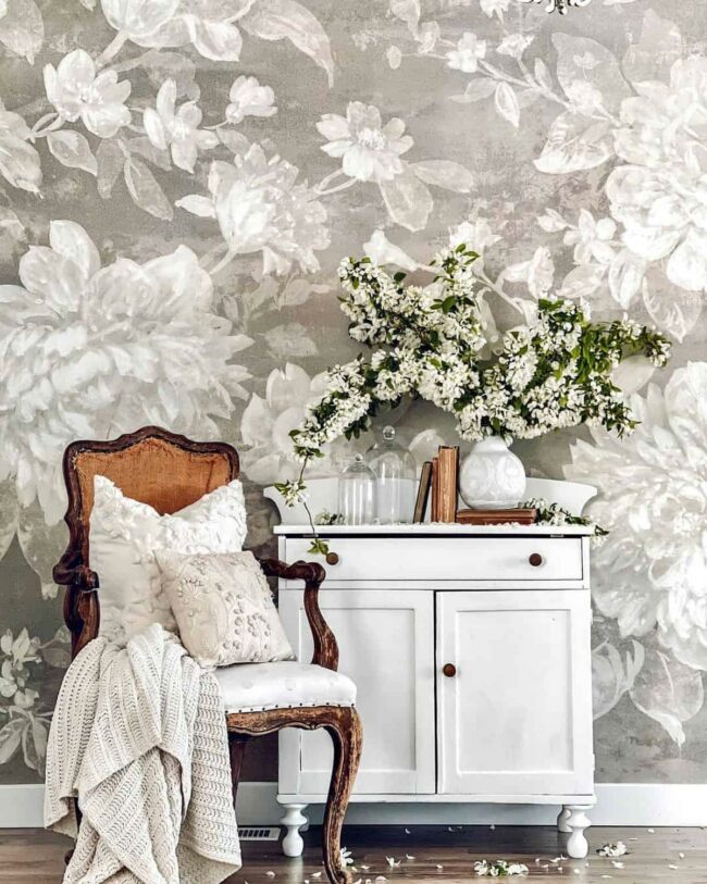 Elegant gray and white floral wall murals instantly elevate a room's ambiance, infusing natural beauty with sophisticated design.
