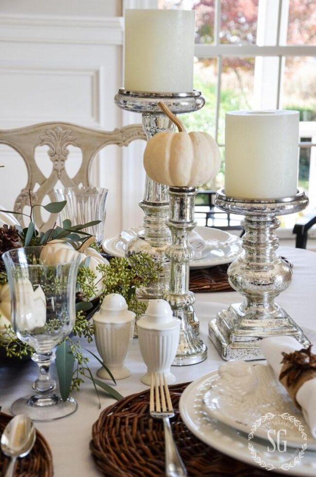 Metallic candleholders sparkle with inviting warmth, casting gentle shadows that dance across your dining space.