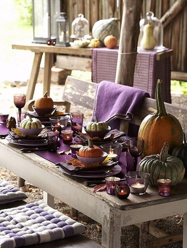 Pumpkins and gourds sprawl across an outdoor table, instantly reshaping your dining space into an autumn wonderland that whispers seasonal magic.