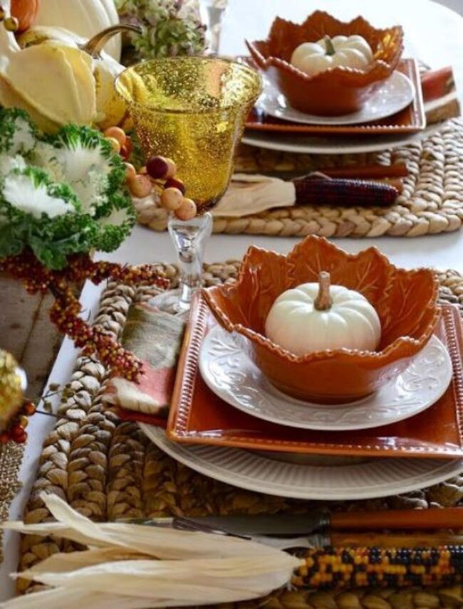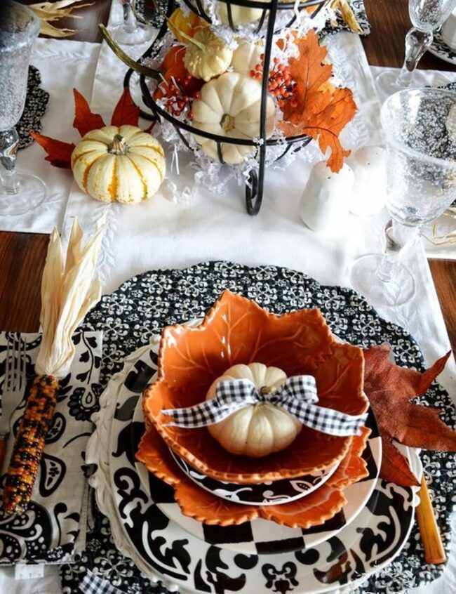 Orange leaf-shaped bowls and ribbon-wrapped white pumpkins instantly evolve your surface into a welcoming harvest scene.