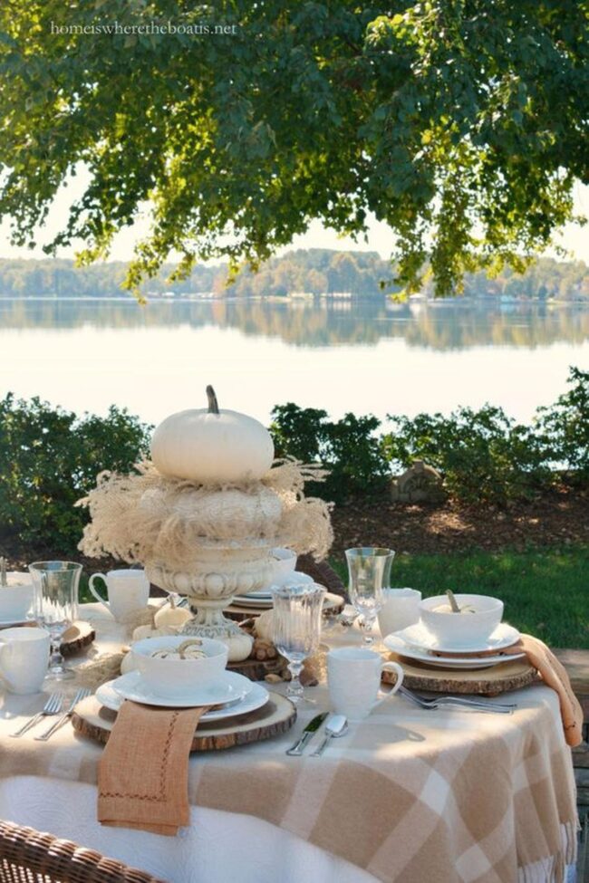 Wooden slices beneath each plate ground the scene with natural charm, inviting guests to sink into fall's embrace.