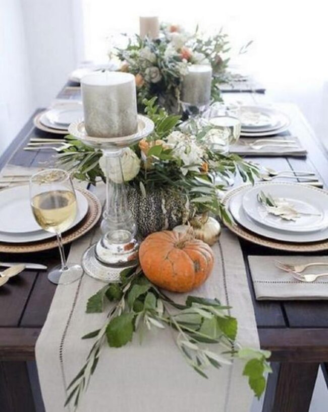 Green leaves and petite pumpkins dancing along the table's center create a natural, eye-catching centerpiece that screams seasonal magic.