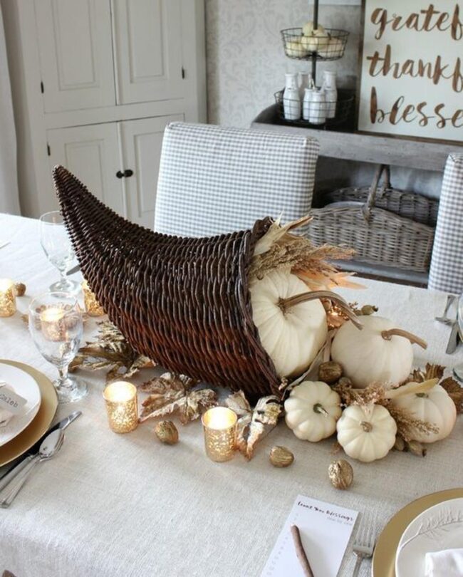Scattered white pumpkins, pine cones, and antlers create a natural centerpiece that whispers woodland charm without feeling overdone.