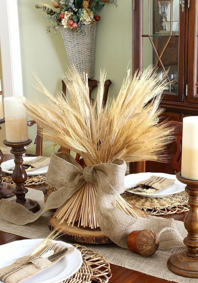 Sunlight dances across a handcrafted wooden table adorned with a charming wheat bundle wrapped in burlap, drawing immediate attention to its centerpiece.