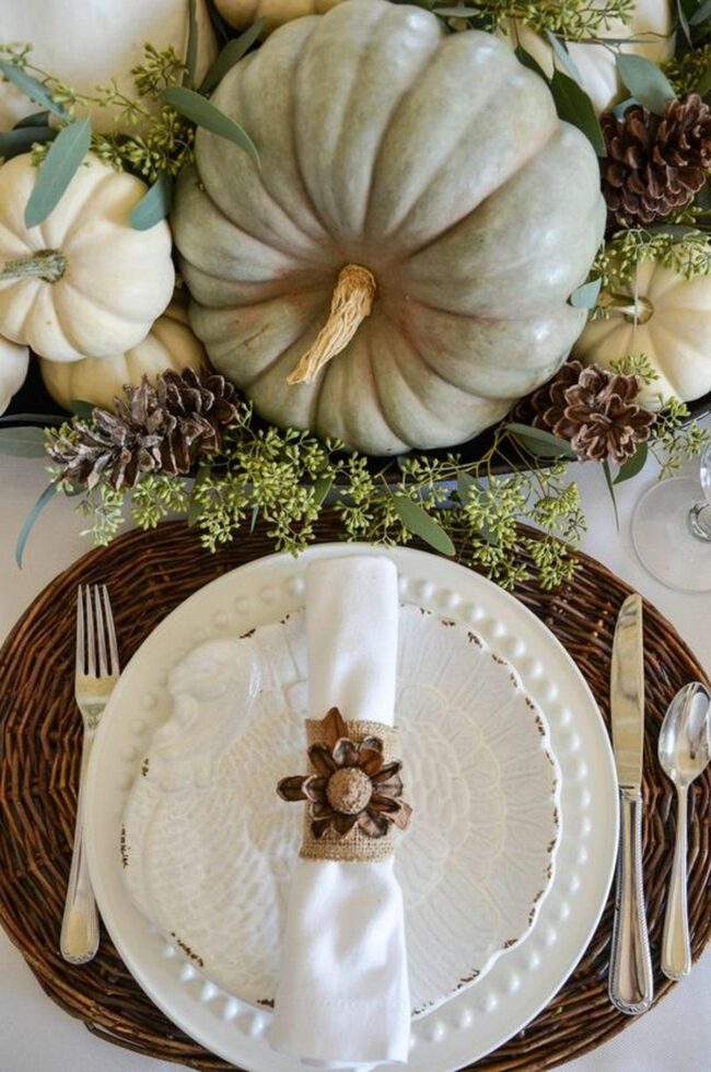 Green and white pumpkins nestled among leafy branches create an instant centerpiece that catches every eye wandering across your dining space.